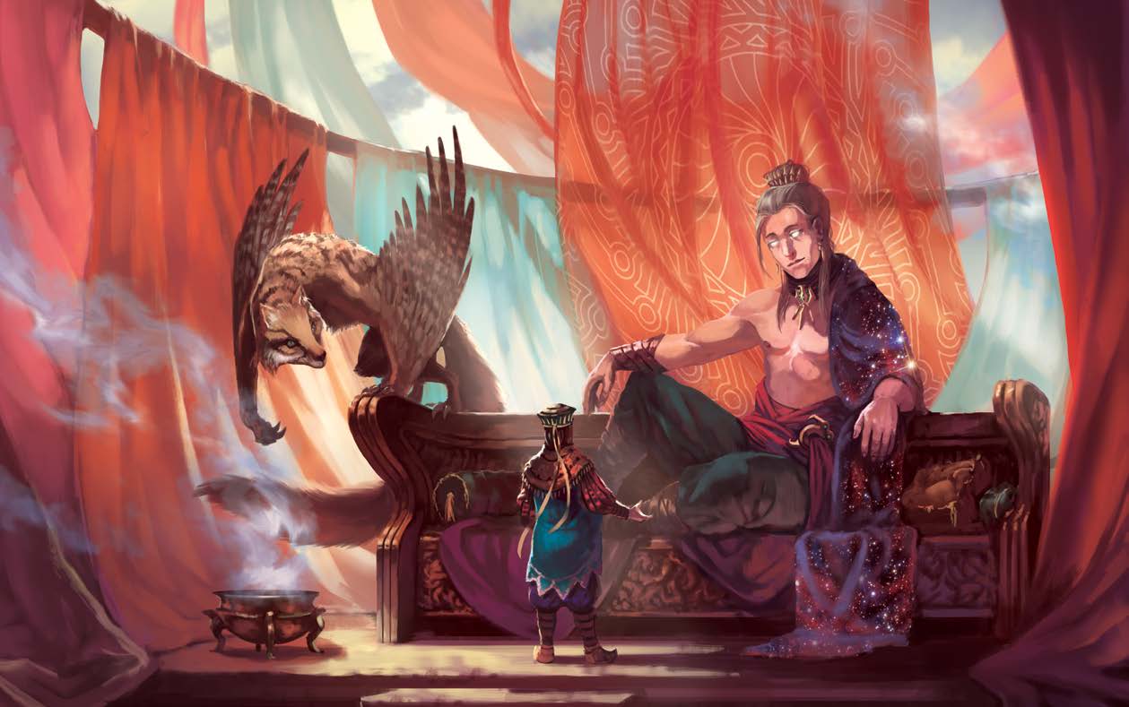 Assim como sua irmã, Aymara, Darmon é um deus sobrenaturalmente feliz. Ele conta piadas no Paraíso e, quando caminha entre os mortais, melhora suas vidas com brincadeiras humorísticas e belas criações. No entanto, seu amor por coisas douradas e objetos bonitos é irresistível, e ele ensinou esse amor às raças mortais, chamando os negócios mercantis de “a mais fina das artes”. Darmon deu às raças mortais muitas das ferramentas básicas necessárias para a civilização: escrita, medição de tempo, rotação de culturas, navegação, comércio, equitação, fabricação de bússolas e muitos outros truques e ofícios úteis. Ele fez isso com seu primo Korak, que ao mesmo tempo ensinou às raças mortais habilidades úteis como costura, tecelagem, fabricação de aço e construção de arcos. Eles fizeram isso por amor aos mortais, amor esse que não diminuiu ao longo das eras. Embora Darmon se deleite com travessuras e esteja sempre feliz em ver coisas horríveis acontecerem com pessoas más (ou mesmo pessoas que apenas pensam muito de si mesmas), ele nunca teve problemas com mortais violando todo tipo de leis. Em seu amor pelos mortais, ele deseja vê-los prosperar. Darmon deseja um mundo livre de formalidades e restrições inúteis. Ele quer substituí-las por riqueza, alegria, boa comida, canções magníficas e, acima de tudo, risadas. Ele raramente é sério, se recusando a abandonar suas brincadeiras e diversão, mas quando é forçado a abandonar o humor, seu temperamento fica tão feroz quanto o de sua mãe, pai e irmã. Ele se alinha com seus pais em conflitos entre os deuses, mas, como os outros deuses jovens, ele tem menos interesse do que seus anciãos em tais rivalidades. Ele é infinitamente curioso, adorando ver e aprender coisas novas, mas valoriza acima de tudo a liberdade de viajar e se movimentar. Darmon é o mensageiro dos deuses, então ele pode se aventurar na esfera mortal para buscar alguém importante ou entregar um decreto divino. Embora o Pacto tenha tornado essas ocasiões menos frequentes, Darmon é o deus que os mortais vivos mais provavelmente encontrarão. Servos de Darmon Darmon tem mil servos entregando mensagens pelo Plano Material e além. Como Darmon é encarregado de mensagens, ele muitas vezes conta com lacaios para levar notas de deus para deus. Seu companheiro mais próximo além de seus parentes divinos é Ix, sua raposa prateada. Darmon se deleita em ver Ix enfurecer Metteron, o leão dourado de Terak. Contos de Ix enganando Metteron são muito amados e contados às crianças para entretenimento.